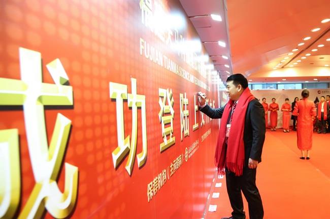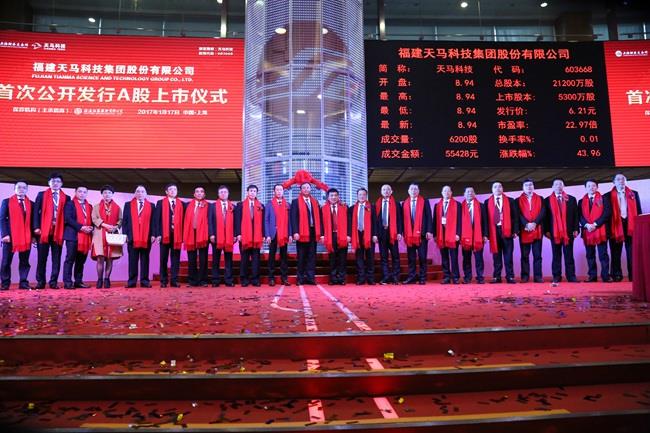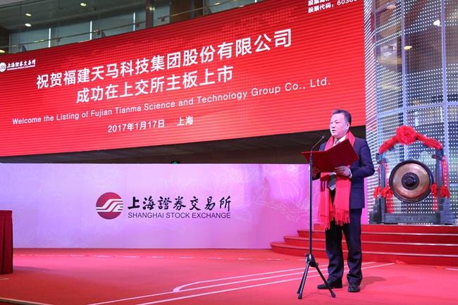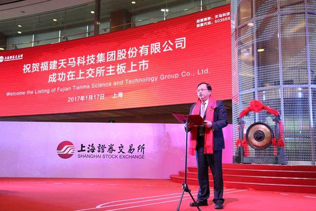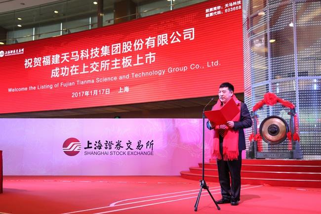 天馬科技訊 1月17日,福建天馬科技集團股份有限公司(證券簡稱“天馬科技”,證券代碼603668)首次公開發(fā)行A股上市儀式在上海證券交易所隆重舉行。天馬科技陳慶堂董事長及福建省福清市人民政府市長張帆,福建省泉州市泉港區(qū)人民政府區(qū)長顏朝暉,海通證券總裁瞿秋平,建設銀行福建省分行副行長王東標,福清市第十六屆人大常委會主任王德玉,政協(xié)泉州市泉港區(qū)第三屆委員會主席連啟明,福清市市委常委、統(tǒng)戰(zhàn)部部長陳存楓,泉州市泉港區(qū)常委、統(tǒng)戰(zhàn)部部長陳龍津,集團董監(jiān)高,行業(yè)協(xié)會、金融機構(gòu)、客戶代表及上市中介機構(gòu)代表等出席上市儀式。陳慶堂董事長和福清市張帆市長、上交所領(lǐng)導共同敲響開市銅鑼,標志著特種水產(chǎn)配合飼料領(lǐng)軍企業(yè)、中國飼料工業(yè)協(xié)會副會長單位——天馬科技正式登陸A股市場。