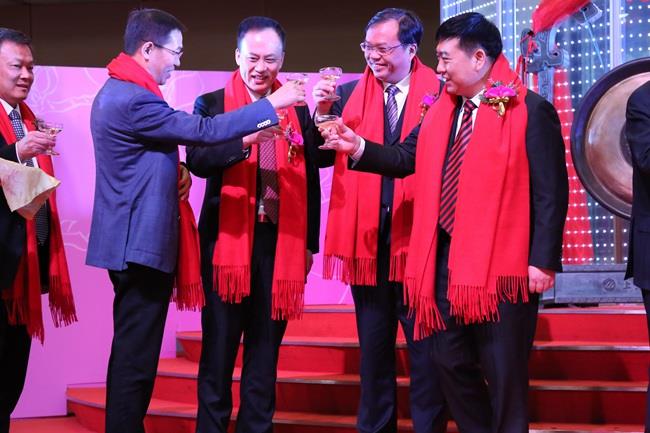上圖為陳慶堂董事長與張帆等嘉賓及上交所領(lǐng)導舉杯共慶天馬科技成功上市