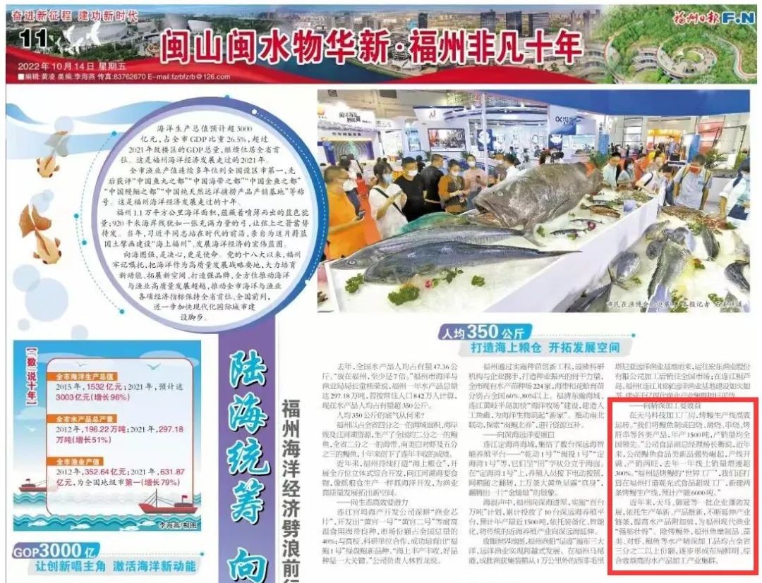 天馬科技訊 1014日,福州日?qǐng)?bào)刊登專版報(bào)道《閩山閩水物華新 福州非凡十年》,報(bào)道了天馬科技集團(tuán)布局鰻魚食品全產(chǎn)業(yè)鏈,以高品質(zhì)預(yù)制菜向精深加工要效益,引領(lǐng)國(guó)鰻崛起,引發(fā)了社會(huì)的廣泛關(guān)注。報(bào)道如下↓↓↓
